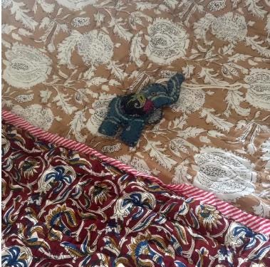 This fabric is made with just two layers of cotton which has been quilted together with little stitches known as kantha