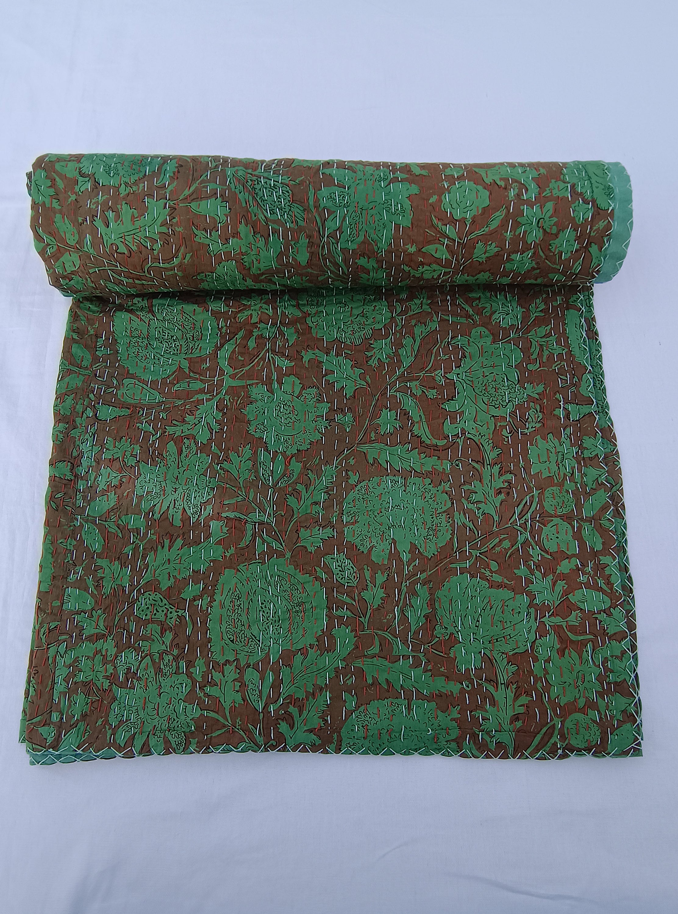 Floral Kantha Quilt, Hand Stitched Cotton, Natural Dyes