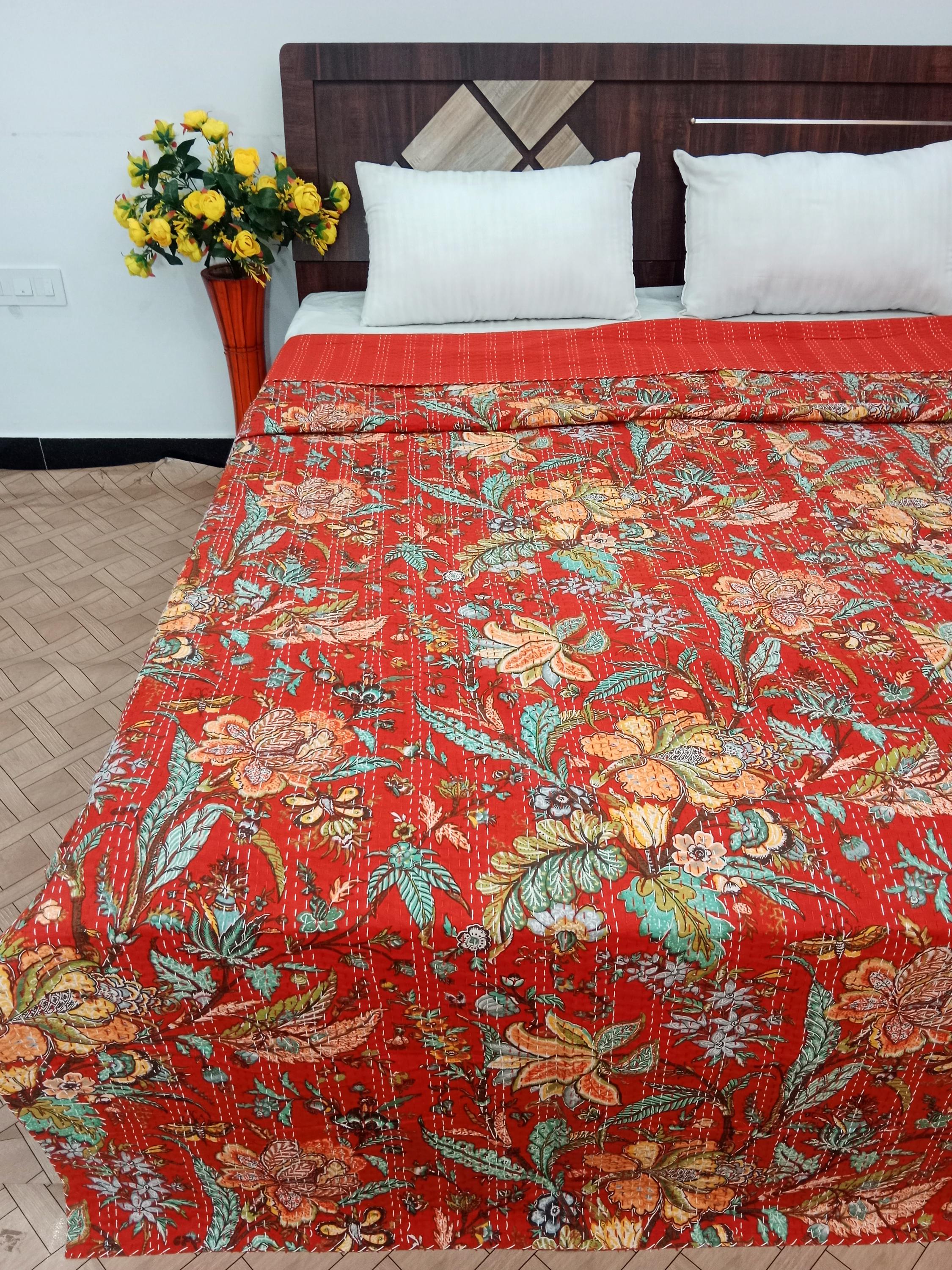 Red Floral Kantha Quilt: Hand-Stitched Indian Cotton Bedspread