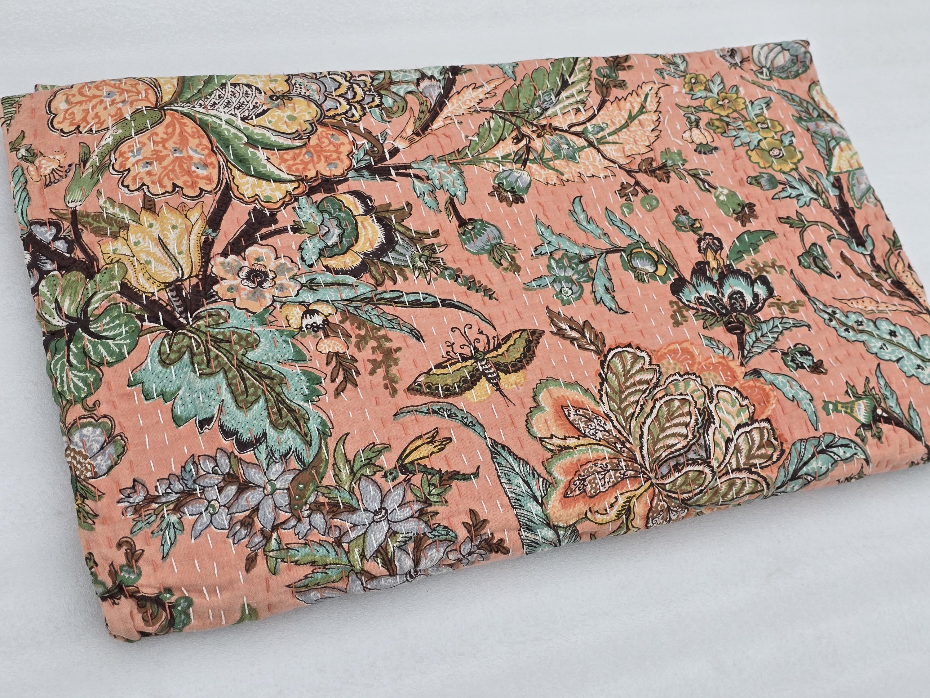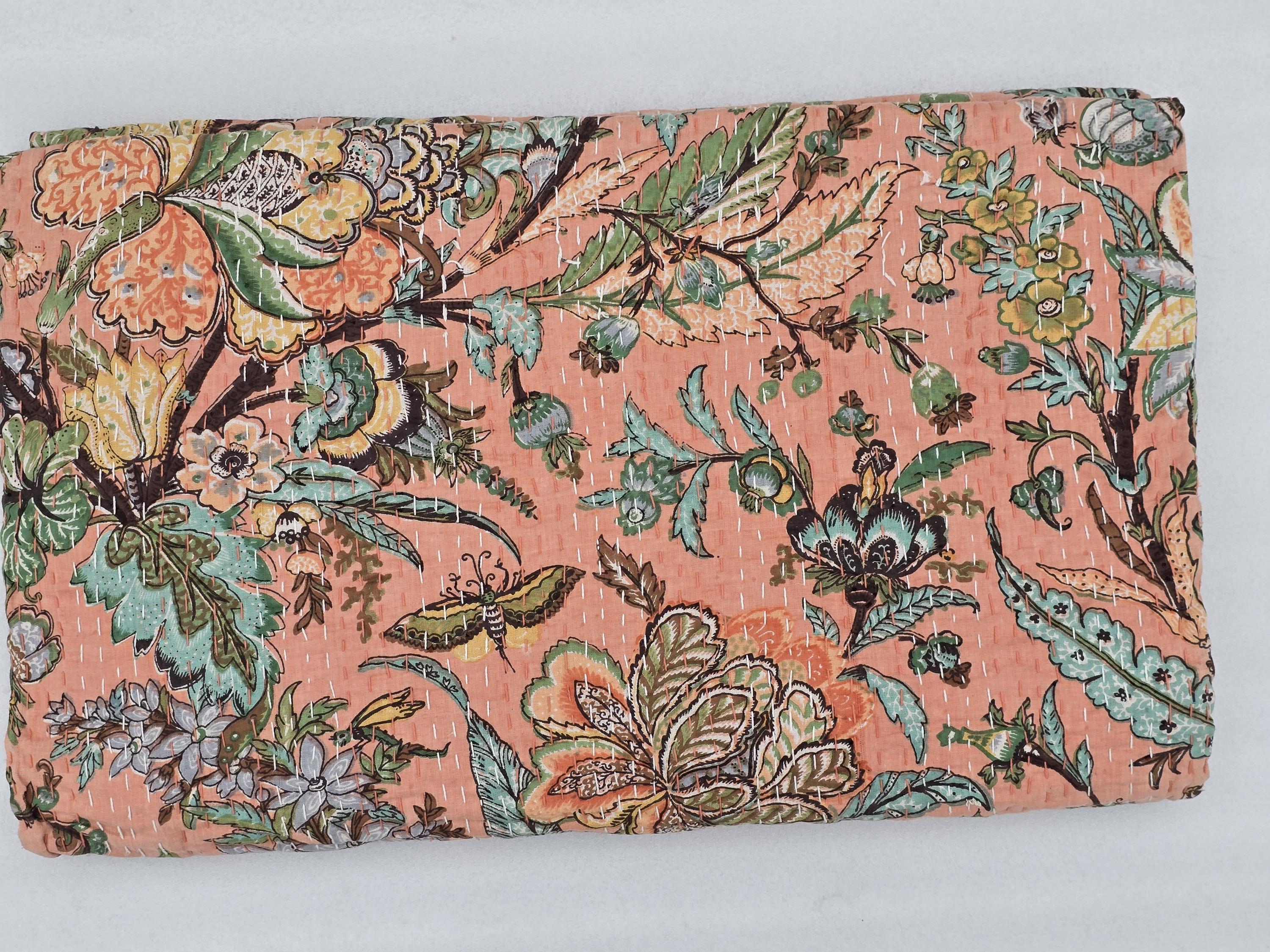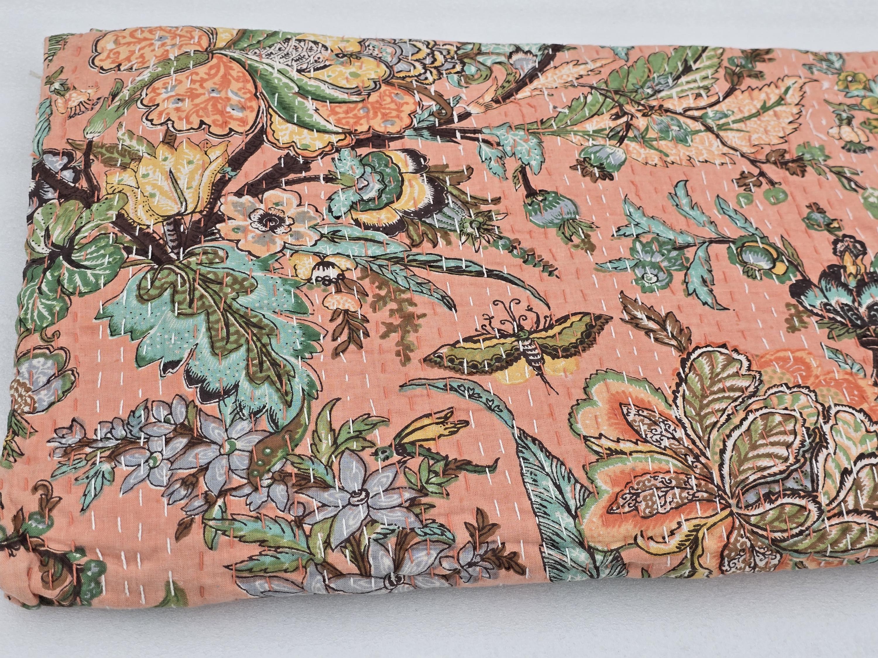 Peach Floral Kantha Quilt: Hand-Stitched Indian Bedding Bedspread floral printed cotton quilt Christmas Gifts peach color home decor kantha