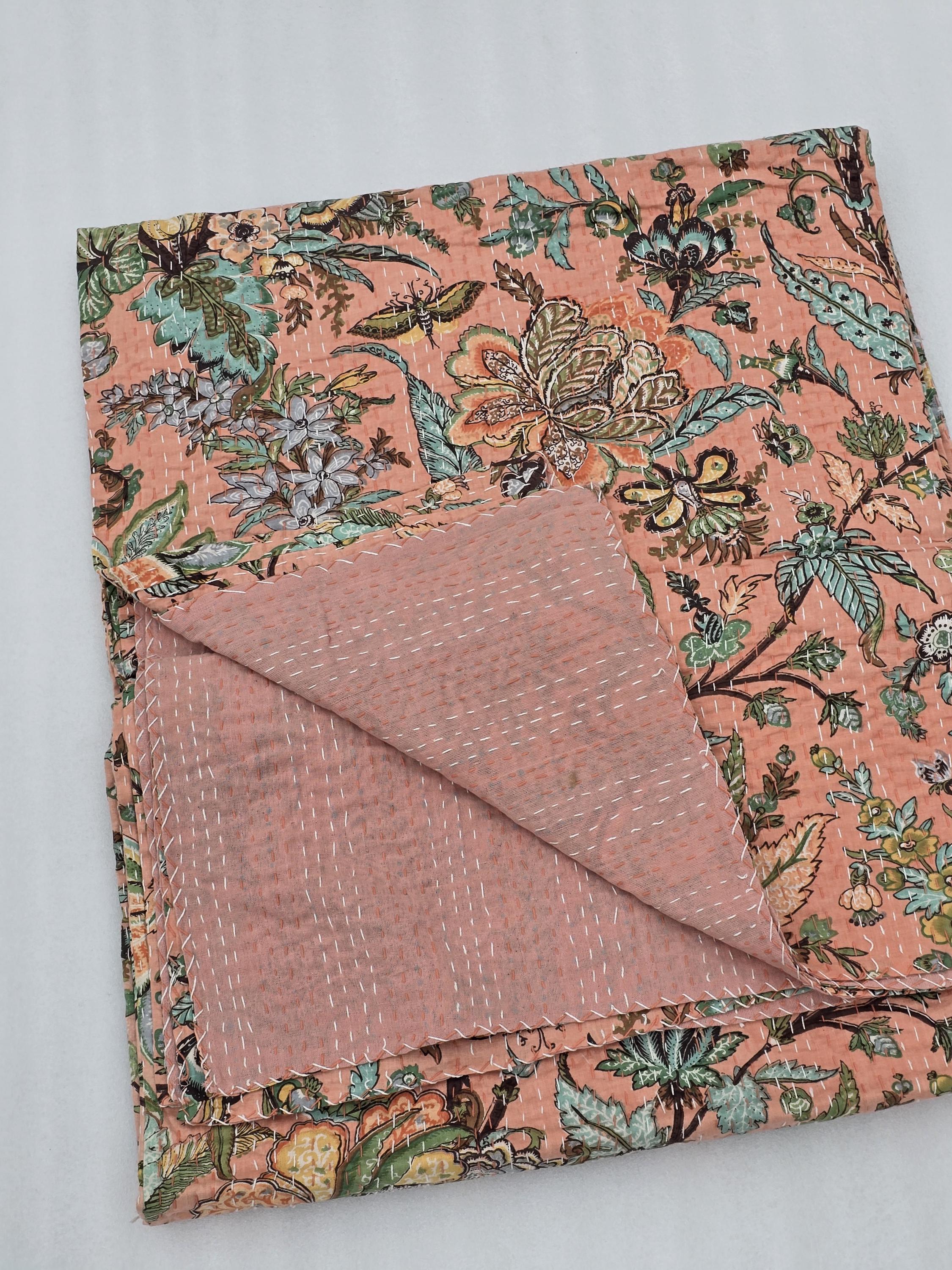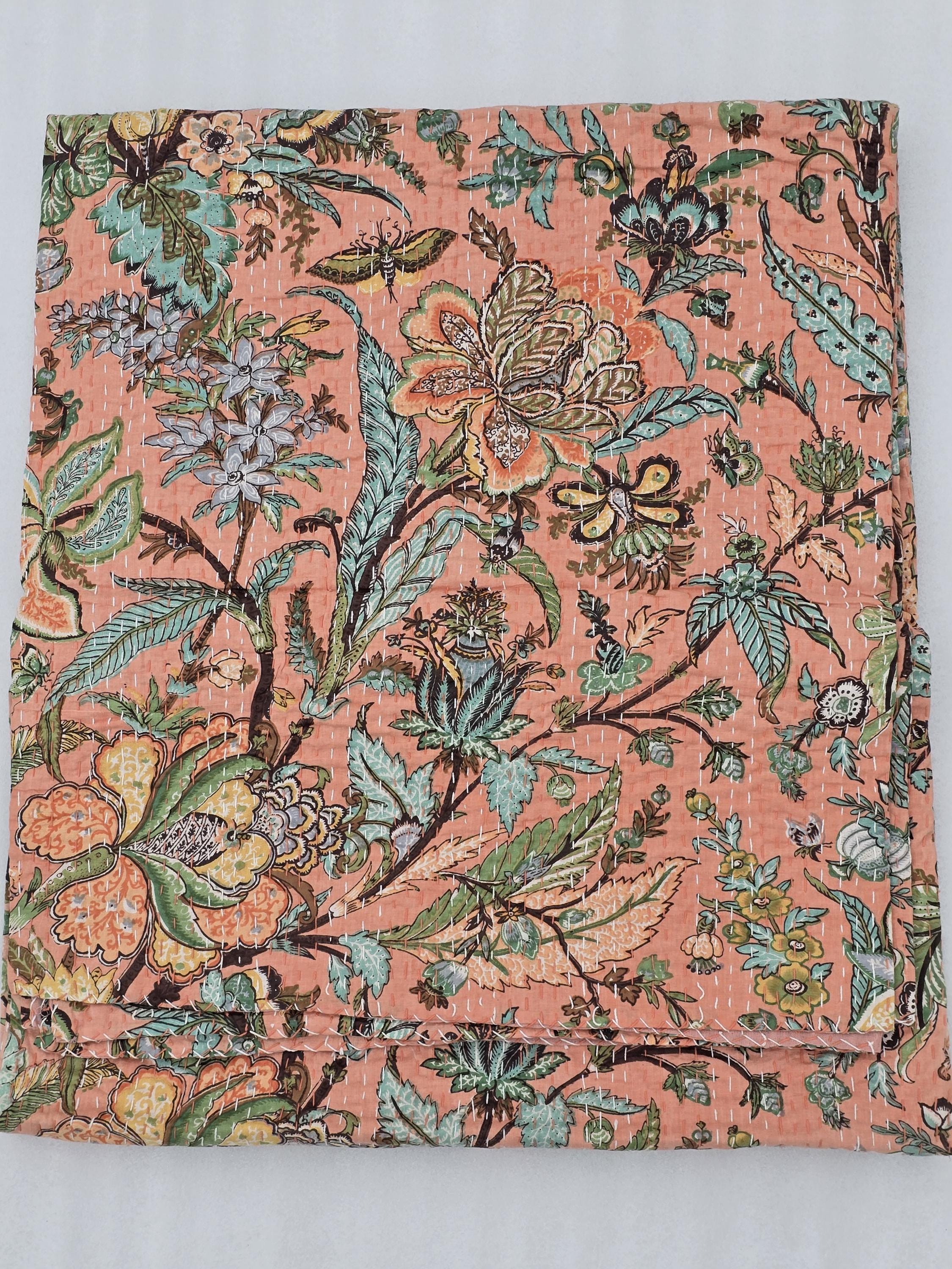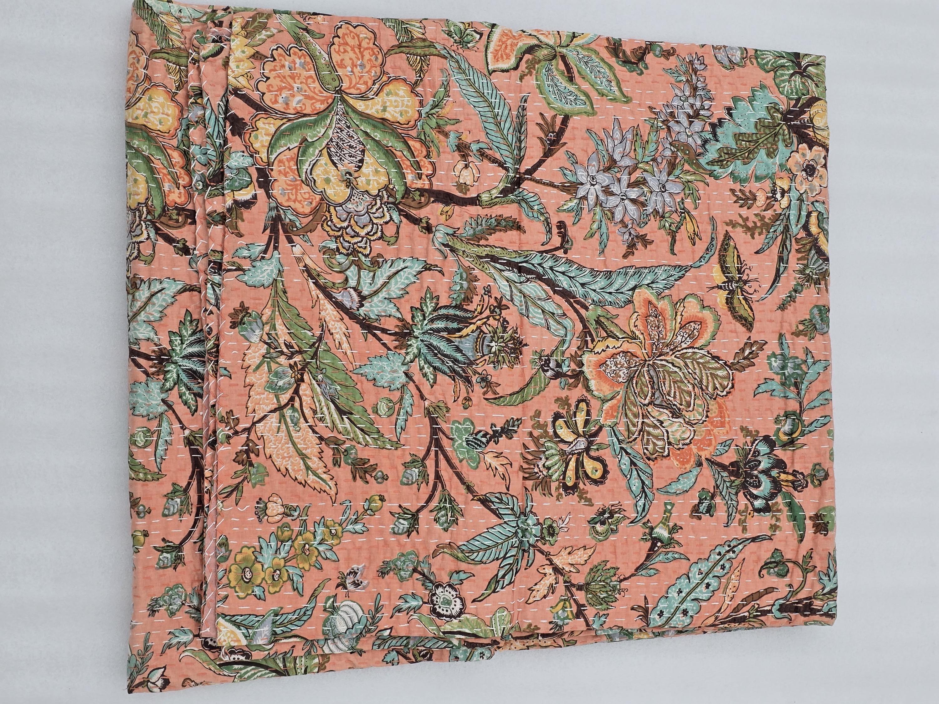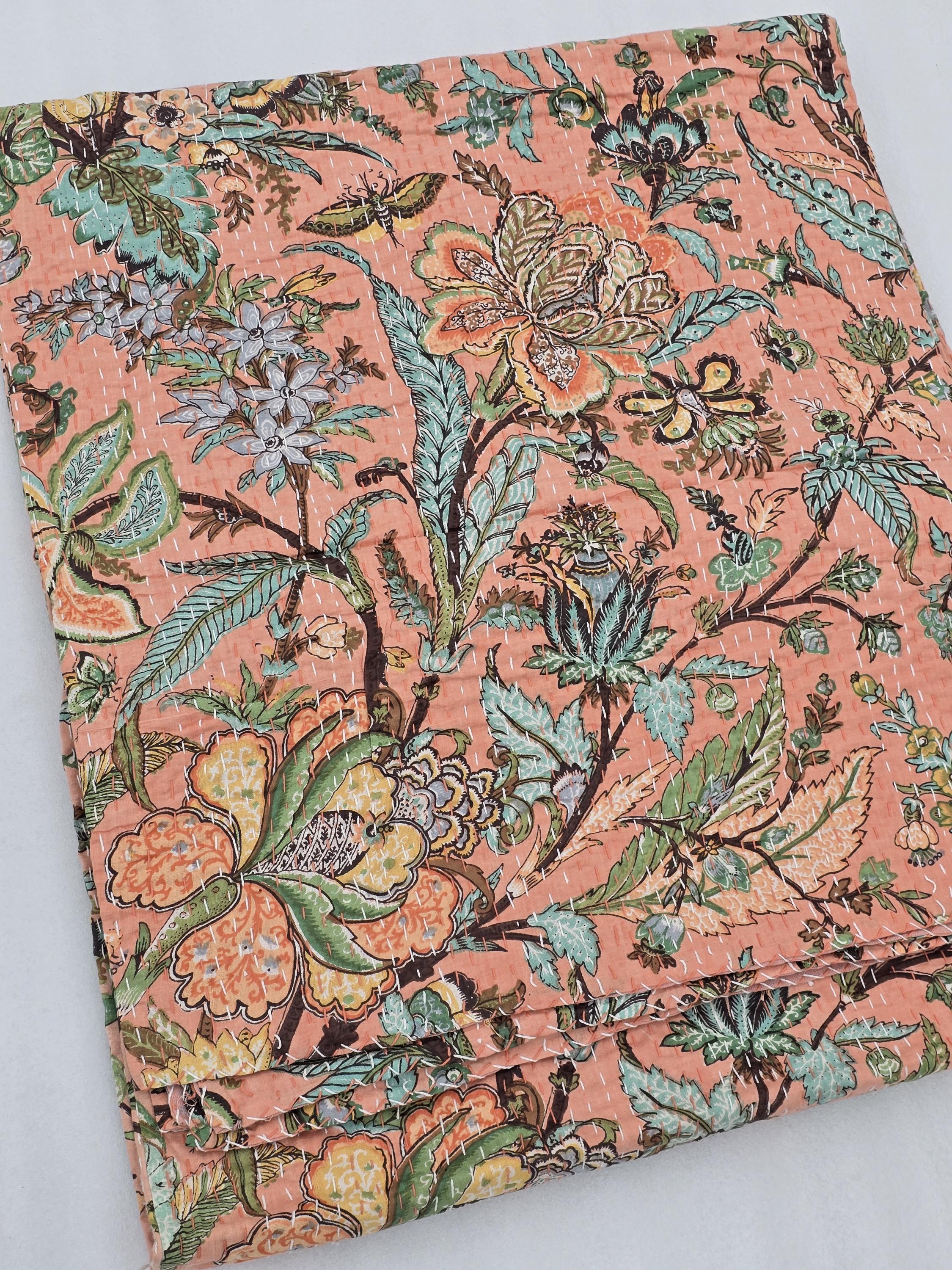 Peach Floral Kantha Quilt: Hand-Stitched Indian Bedding Bedspread floral printed cotton quilt Christmas Gifts peach color home decor kantha