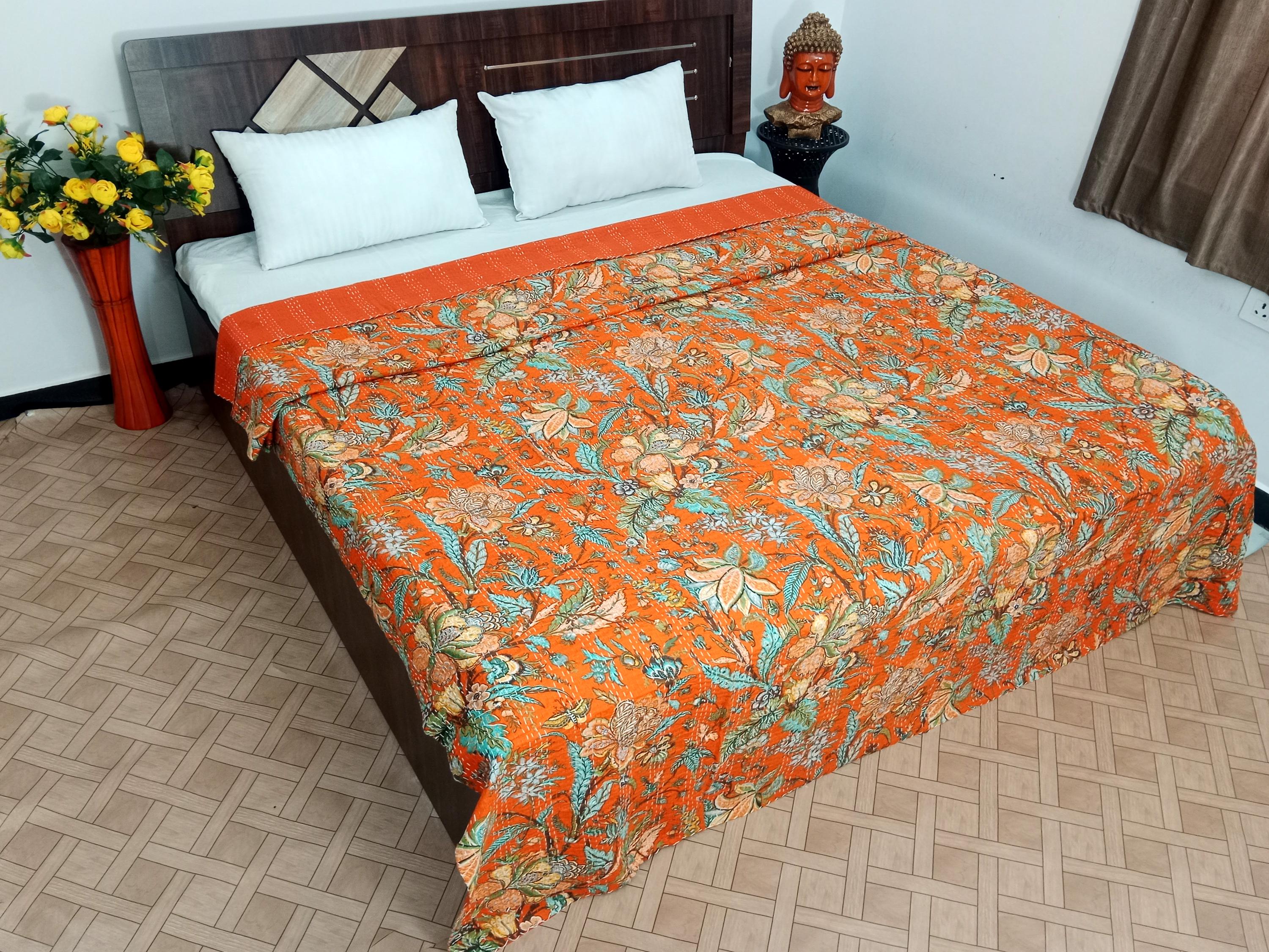 Orange Floral Kantha Quilt: Hand-Stitched Indian Cotton Bedspread