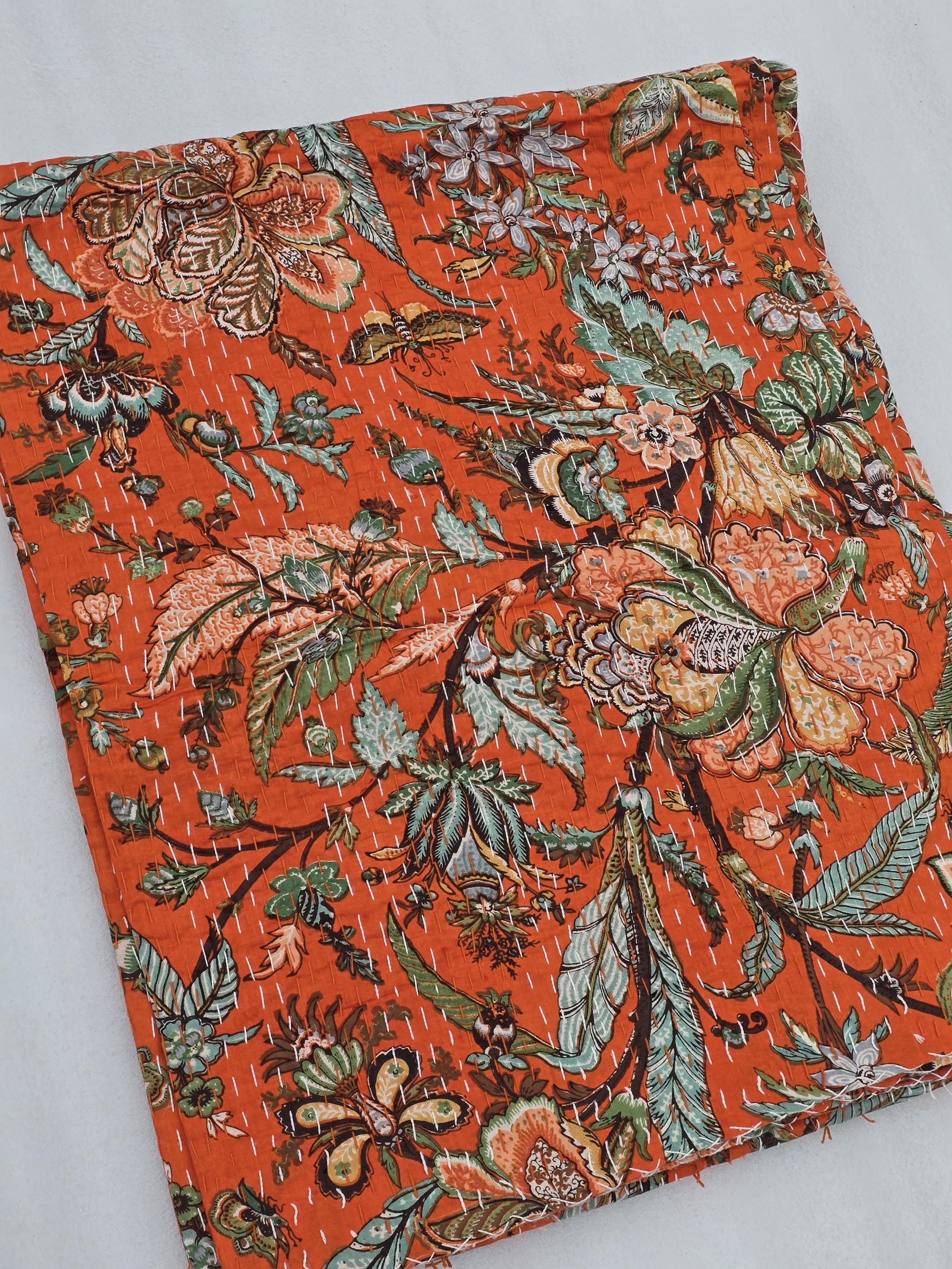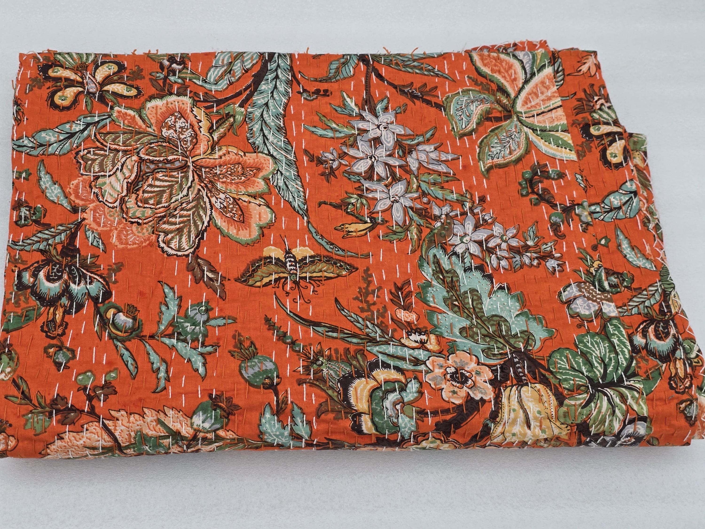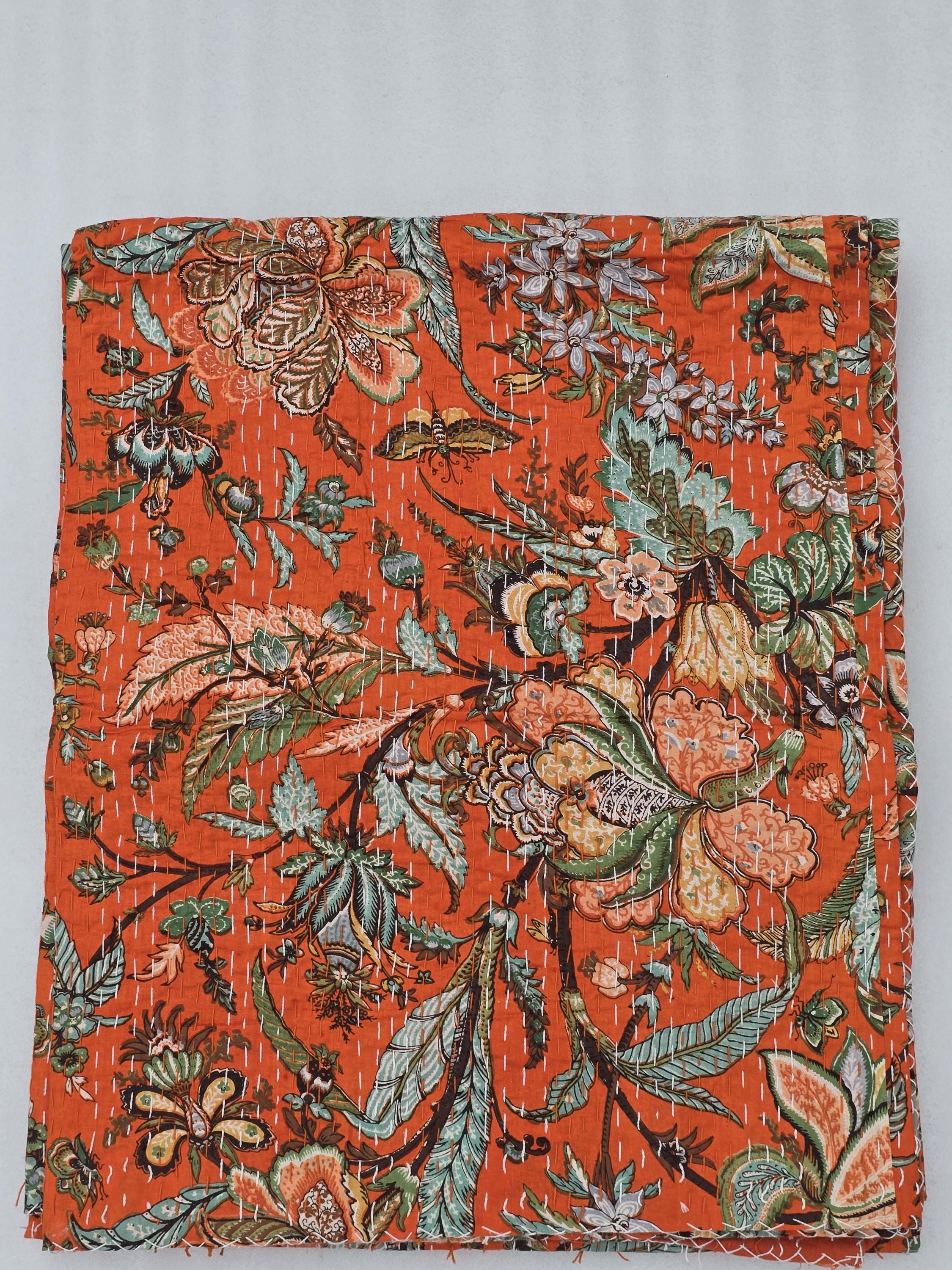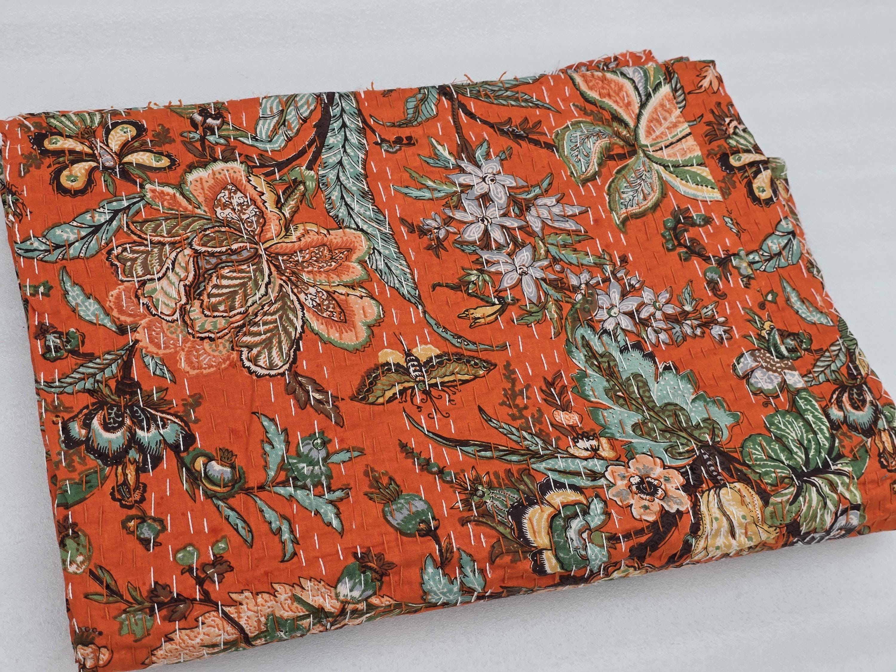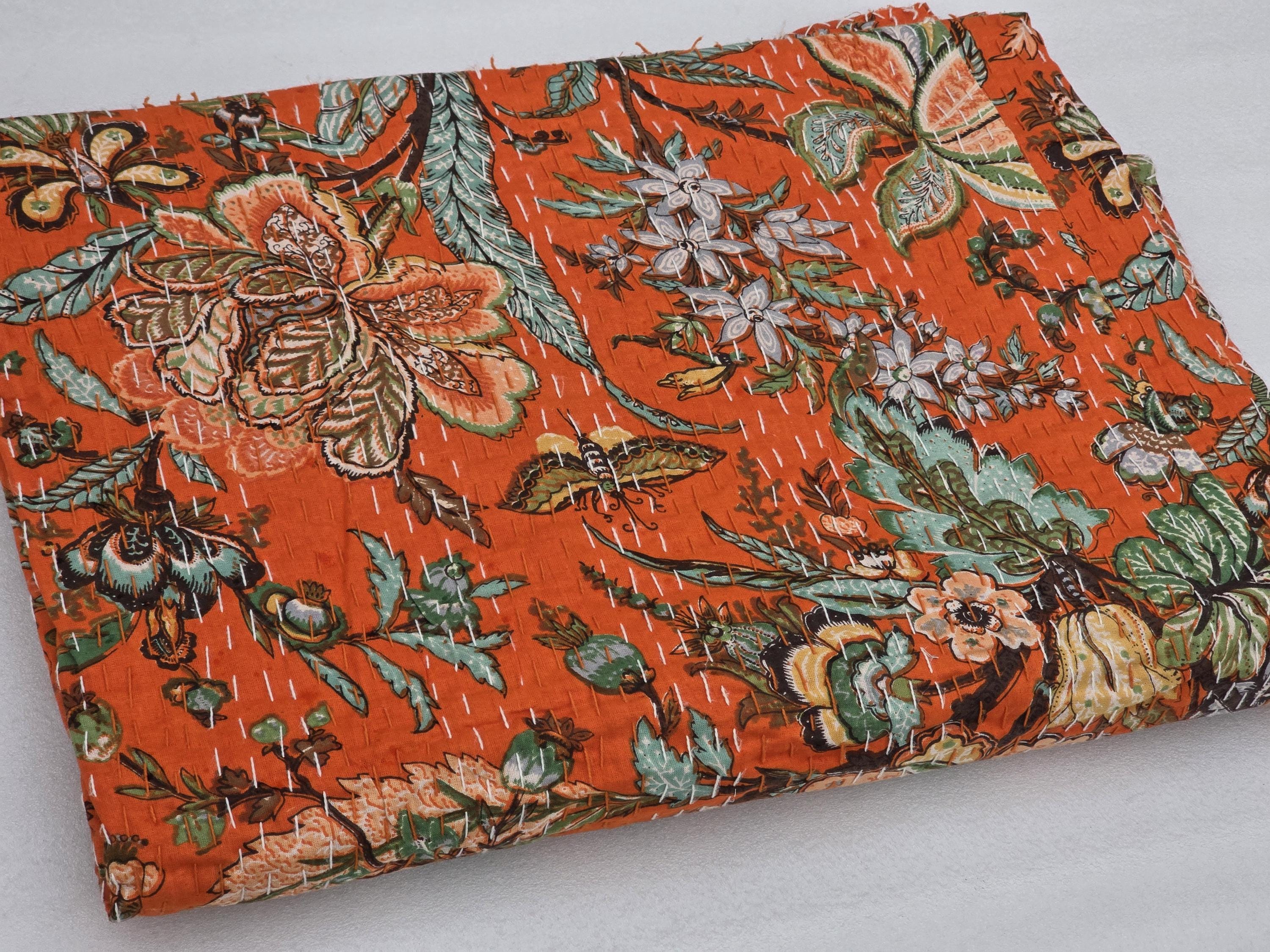 Orange Floral Kantha Quilt: Hand-Stitched Indian Bedding Bedspread floral printed cotton quilt Christmas Gifts