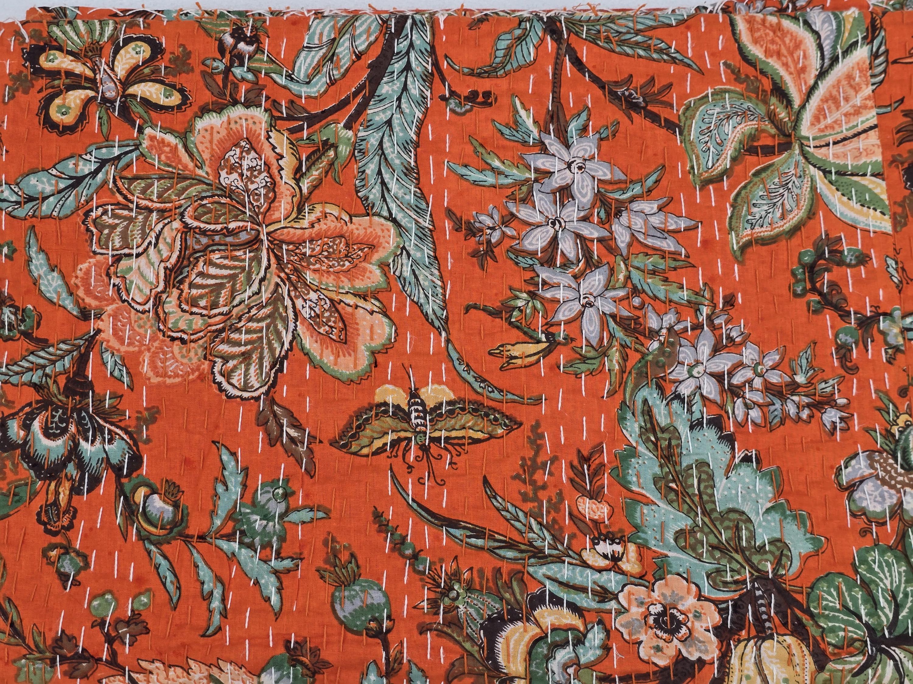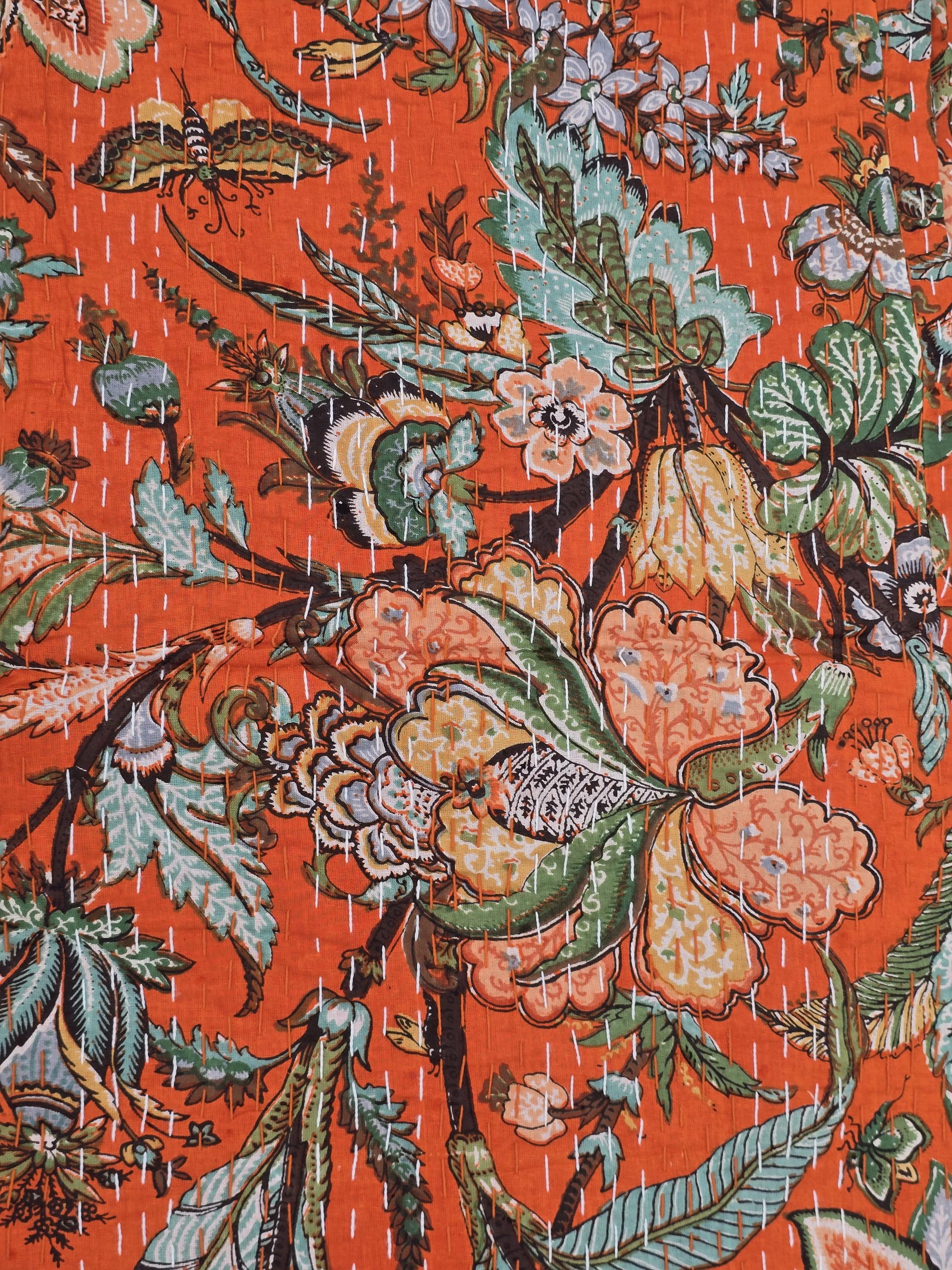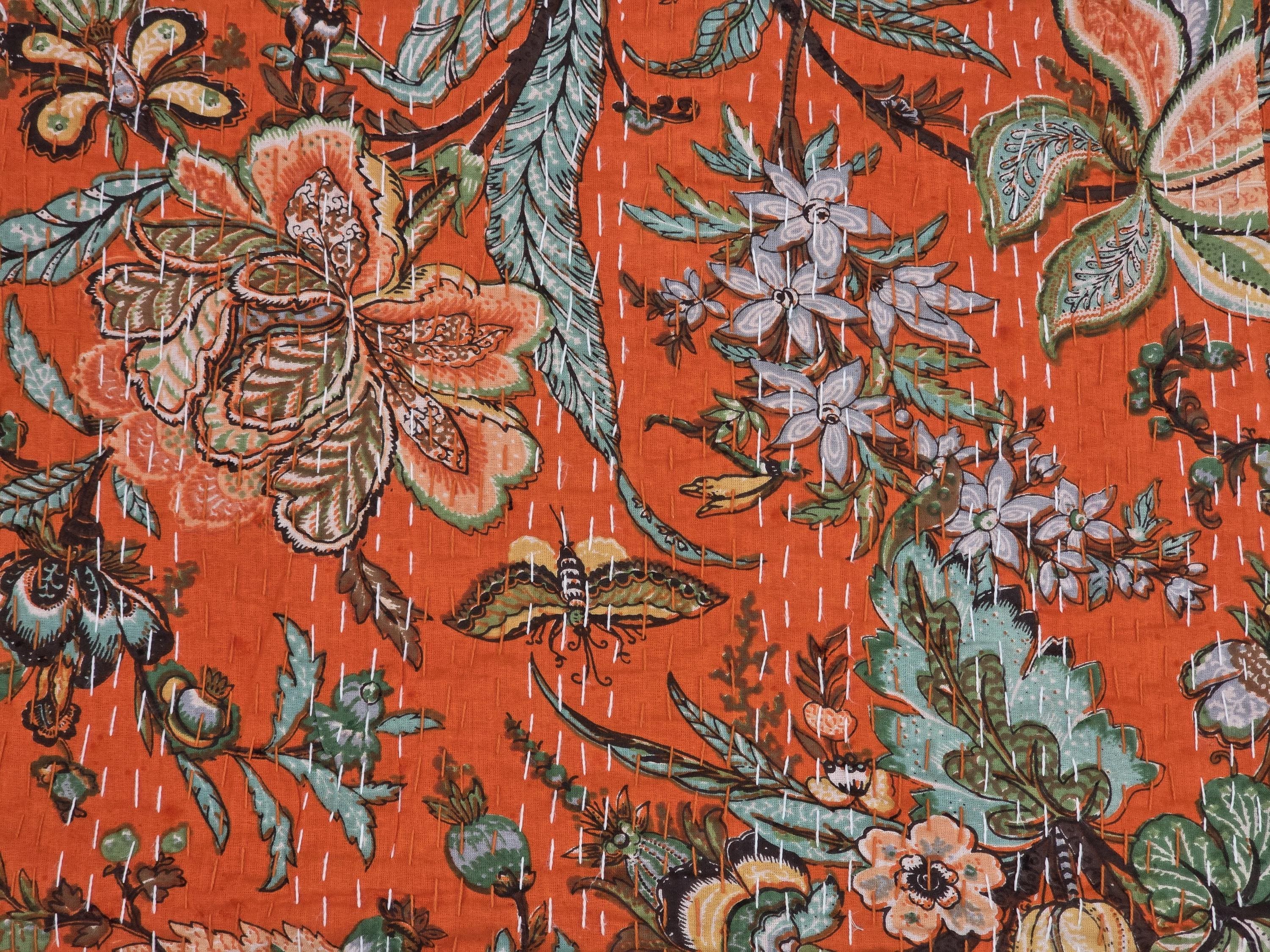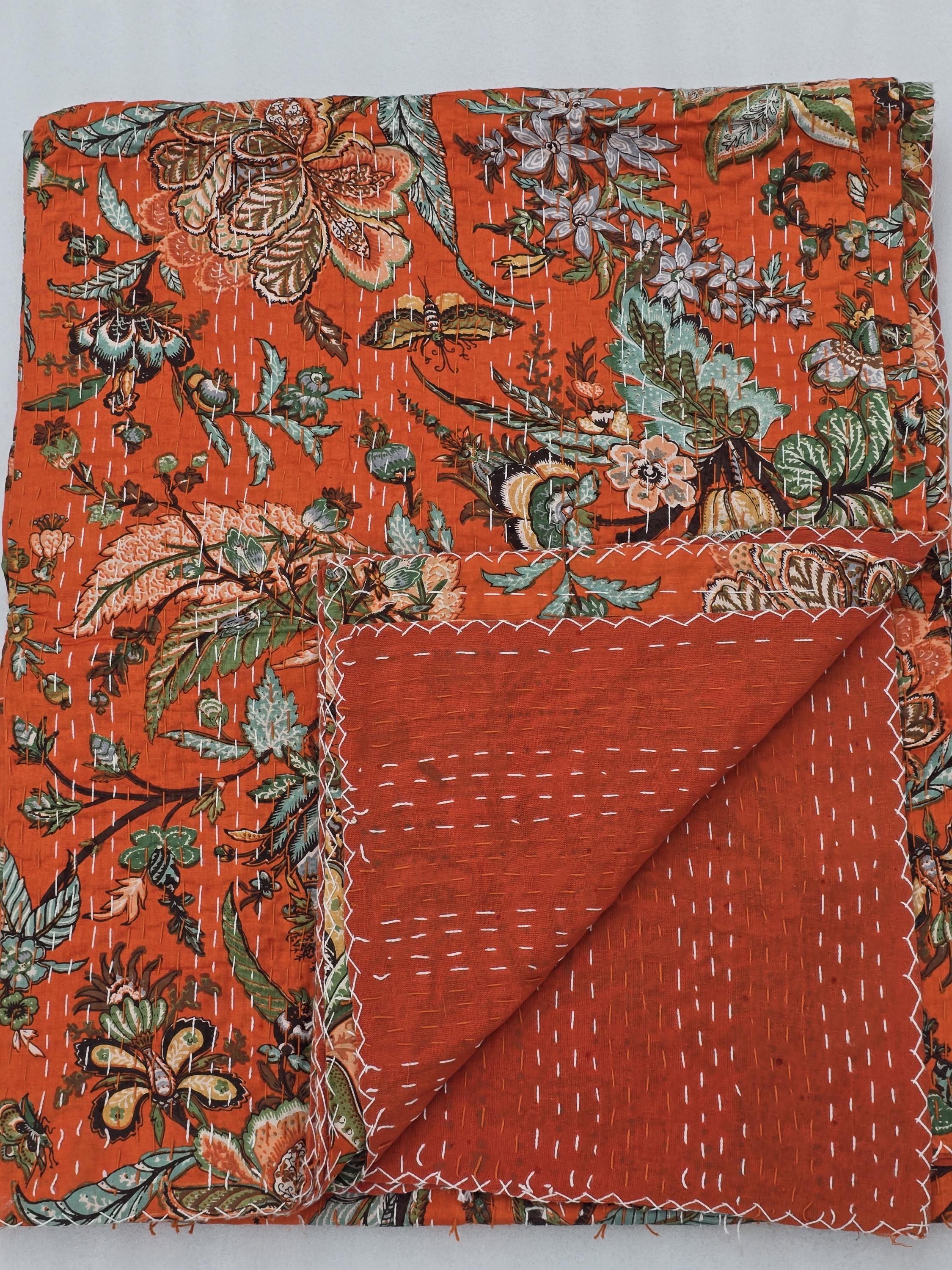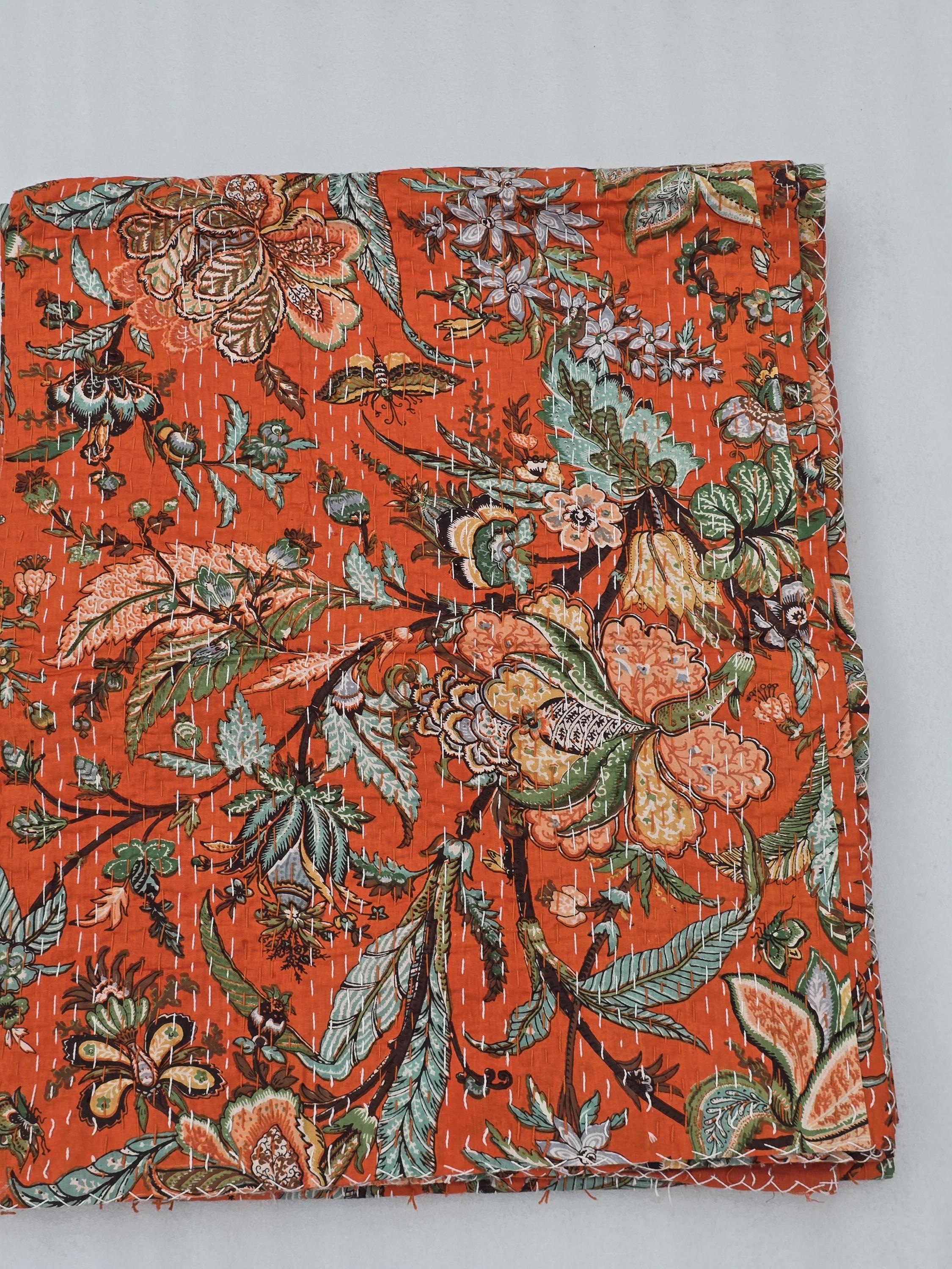 Orange Floral Kantha Quilt: Hand-Stitched Indian Bedding Bedspread floral printed cotton quilt Christmas Gifts